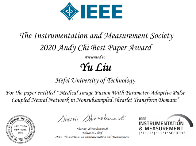近期,仪器测量领域国际期刊IEEE Transactions on Instrumentation and Measurement (IEEE TIM)主编Shervin Shirmohammadi教授(IEEE Fellow)发来贺信:我院生物医学工程系刘羽副教授作为通讯作者发表在该刊上的论文“Medical Image Fusion With Parameter-Adaptive Pulse Coupled Neural Network in Nonsubsampled Shearlet Transform Domain”荣获2020年度IEEE TIM Andy Chi Best Paper Award,即该期刊2020年度最佳论文奖。该奖项由IEEE仪器测量学会于2010年成立,每年从IEEE TIM前一年发表的所有论文中遴选出唯一1篇获奖。本次获奖使英国上市公司365成为继清华大学、西北工业大学、哈尔滨工业大学之后国内第四家获得该奖项的单位。