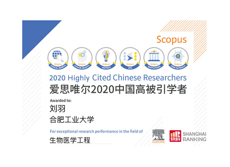 4月22日,爱思唯尔(Elsevier)发布2020“中国高被引学者(Highly Cited Chinese Researchers)”榜单。我院生物医学工程系教师刘羽副教授入选该榜单(入选学科:生物医学工程)。