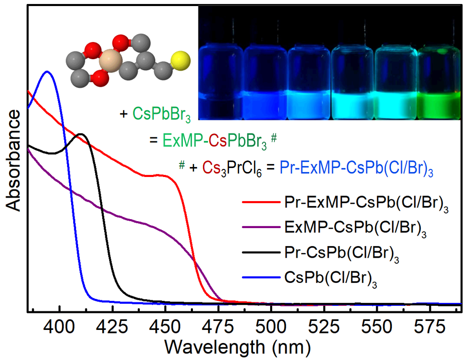 高性能卤素钙钛矿量子点发光材料的荧光量子效率接近100%,在量子点基础研究和应用研究领域均具有重要研究价值。近几年应用研究聚焦的方向包括:如何制备高性能蓝光量子点材料,如何解决色转换LED应用中光稳定性问题和如何提升电致发光应用中的载流子注入效率。我院王向华课题组,依托安徽省特种显示和成像技术创新中心,测量理论与精密仪器安徽省重点实验室,根据巯丙基硅氧烷(MPTMS)在控制硫化铅纳米团簇生长,实现吸收增强等实验观测中的重要作用,推测其在钙钛矿量子点改性方面的应用价值。课题组采用配体交换和原位钝化的方式引入硅氧烷配体,在上述三个应用研究方向取得了重要进展。