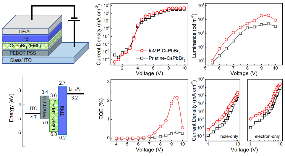 采用原位硅氧烷钝化技术形成单分子层厚度的配体壳层,有效解决了光致发光荧光量子效率与电致发光应用中载流子注入效率之间的矛盾,原位硅氧烷钝化的量子点具有更高的荧光量子效率和更均匀的尺寸(99%,尺寸分散度4%),同时载流子注入效率也提升了一个数量级(图3)。