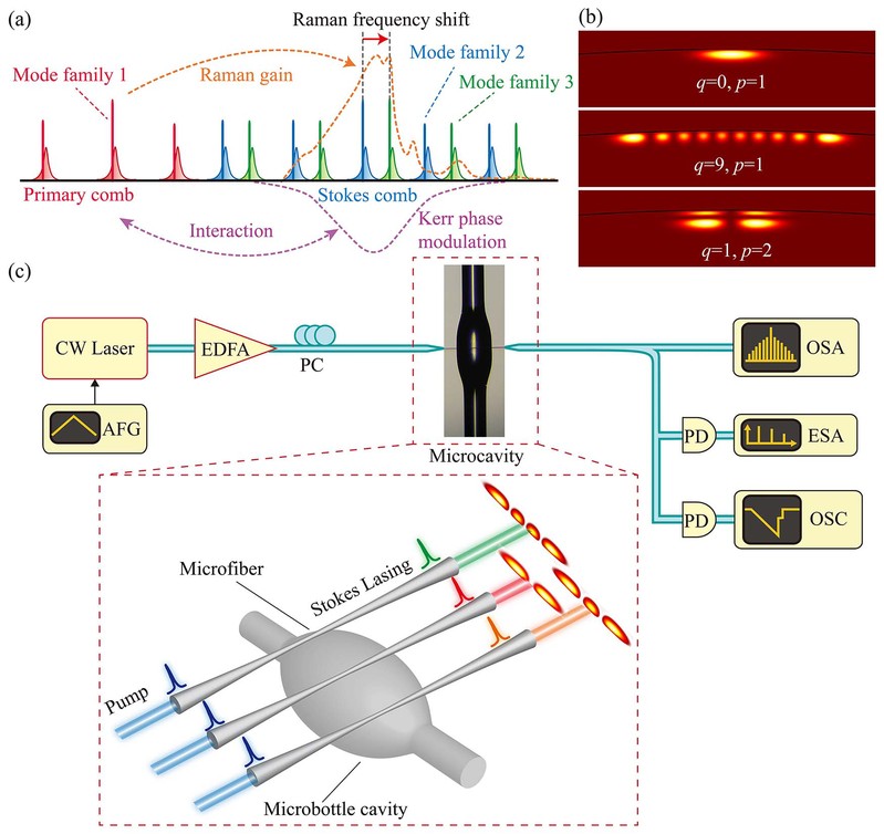研究团队基于微瓶腔的模式理论和耦合Lugiato Lefever (LL)方程,从理论上推导和分析了微瓶腔内拉曼光频梳的调谐机理和产生工作过程,证明了百纳米光谱调谐的可能性。在实验中,该团队利用微瓶腔特殊的模式结构,证明了不同横向模式族的选择性激发能够产生大范围的光谱调控,理论和实验证明了新型拉曼光频梳调控方法的普适性。此外,通过改变微腔半径、或者调节泵浦功率也可以实现拉曼光频梳的光谱调谐。同时,实验中观测到二维拉曼-克尔光频梳的多模状态激发和切换,包括克尔光频梳、单频拉曼激射、多模拉曼激光和孤子晶体态。因此,新型拉曼微激光器可以作为高性能的锁模飞秒光频梳光源,应用于光钟、6G通信、精密光谱测量等应用系统。