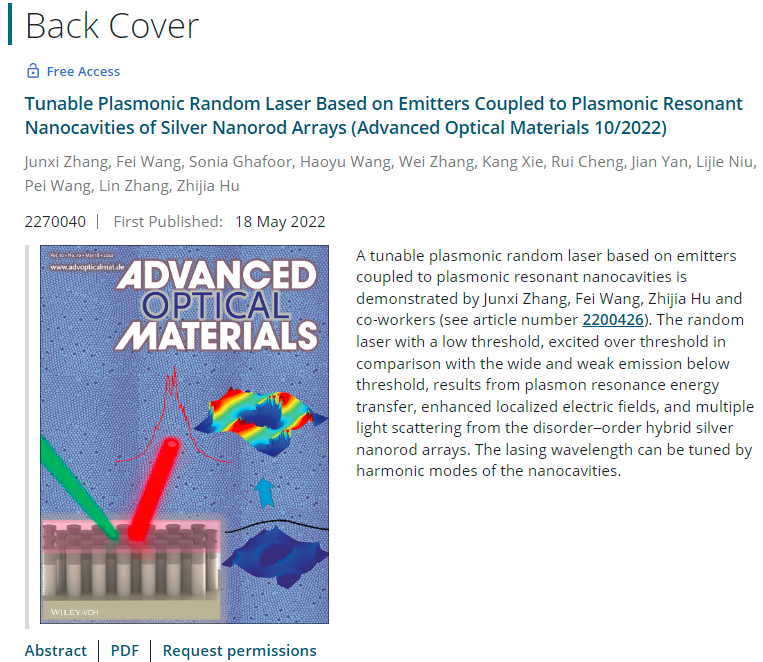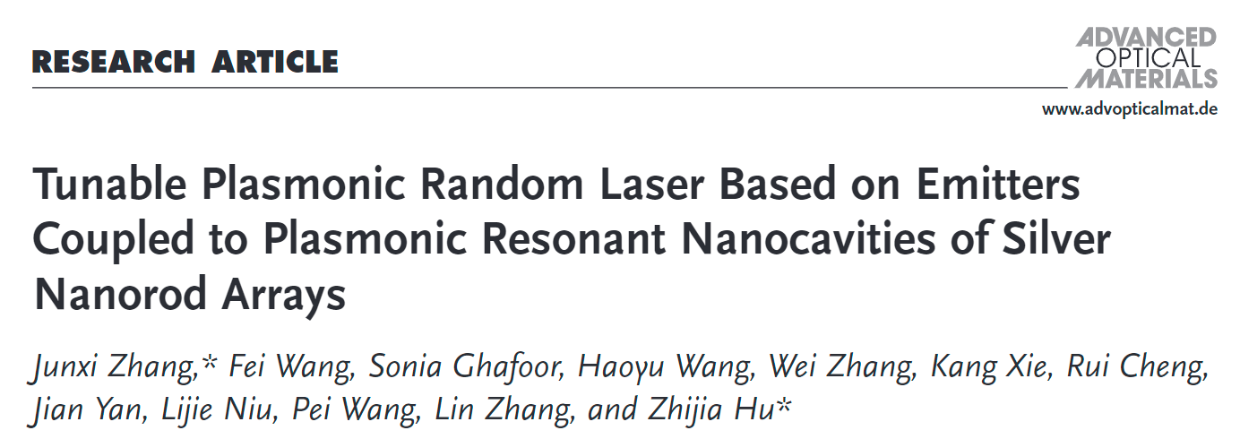 近日,我院光电信息科学与工程系张俊喜研究员课题组在基于银纳米棒阵列表面等离激元共振腔与发光体的耦合实现可调谐表面等离激元随机激光方面取得新进展,相关研究成果以"Tunable Plasmonic Random Laser Based on Emitters Coupled to Plasmonic Resonant Nanocavities of Silver Nanorod Arrays"为题,发表于Advanced Optical Materials (2022, 10: 2200426)。
