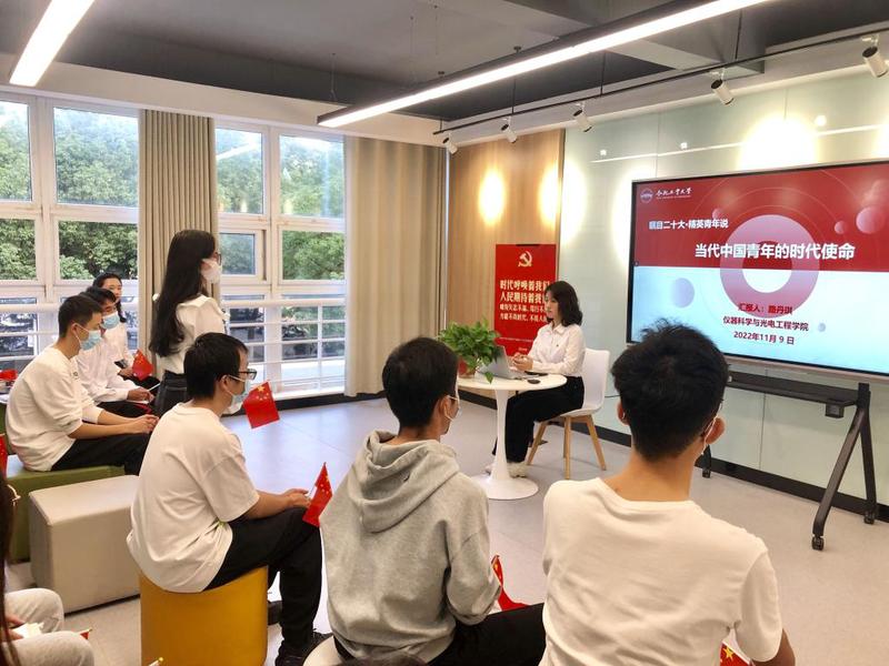 讲述百年奋斗史,精英青年展风采。宣讲团成员赵岚同学以《从一大到二十大见证党的奋斗历程》为题,讲述了中国共产党从创建、投身大革命的洪流,到夺取新民主主义革命的全国性胜利,再到带领中国人民进入社会主义改革开放和现代化建设新阶段,开创中国特色社会主义新时代的发展历程。路丹琪同学以《当代青年的使命担当》为题,从“新坐标:历史地位”“新征程:回顾二十大”“新时代:学习要求”“新使命·青年担纲”四个方面解读了党的二十大报告的深刻内涵,重点剖析了报告中关于教育、科技、人才的新观点新论断新思想,鼓舞仪器学子坚定理想信念、担负时代重任、勇立时代潮头、矢志爱国奋斗。同学们还观看了时代变迁的视频,重温了党领导人民从站起来到富起来、从跟跑到领跑、创造一个个人间奇迹的光辉历程,领会了党的二十大精神的精髓要义,坚定了中国特色社会主义道路自信、理论自信、制度自信、文化自信。在学习交流环节,来自新疆伊宁的哈萨克族女大学生古丽达娜·奴尔金俄斯激动地说:“百年来,我们党团结带领全国各族人民奋力实现国家富强、民族振兴、人民幸福,我们感到生逢其时,重任在肩,将坚定不移听党话、跟党走,勇做实现中华民族伟大复兴的先锋力量!”