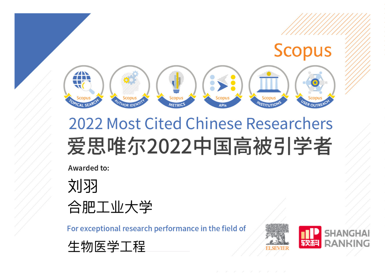 2023年3月28日,爱思唯尔(Elsevier)发布2022“中国高被引学者”榜单,我院生物医学工程系刘羽副教授入选(入选学科:生物医学工程)。刘羽副教授已连续三年入选爱思唯尔“中国高被引学者”榜单(2020-2022)。