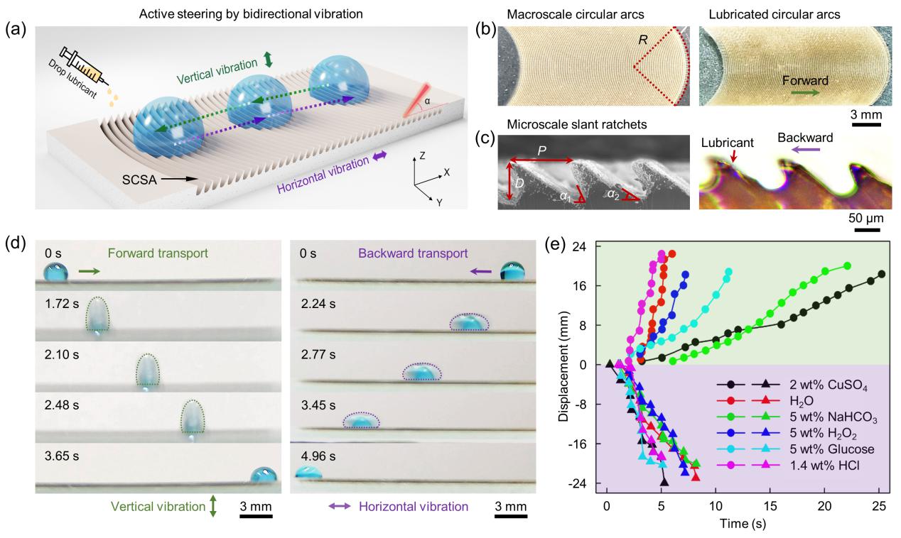 图1. (a) 机械振动驱动液滴定向转向示意图。(b) 宏观尺度下的圆弧阵列注入润滑剂前后的光学图像。(c) 倾斜棘轮阵列的SEM图像。(d) 液滴在SCSA上的转向运输。(e) 不同种类的液滴运输位移与时间的关系。