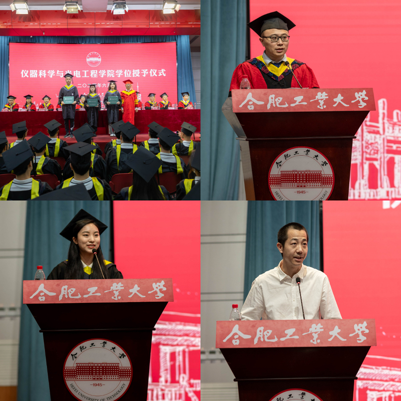 毕业生代表,“校长奖”获得者赵星月同学发言,她回忆四年前,第一次看到的校园、第一次漫步的斛兵塘、第一次驻足的励人湖,第一次在费业泰前辈塑像前的沉思,回味四年中,学校与学院的辛勤栽培,每一位老师的悉心教导,同学们的温情鼓励与支持,她号召同学们要秉承学院精益求精文化,用实际行动践行“厚德 笃学 崇实 尚新”的校训,厚植家国情怀,涵养进取品格,为服务国家富强、民族复兴、人民幸福贡献出自己的力量。