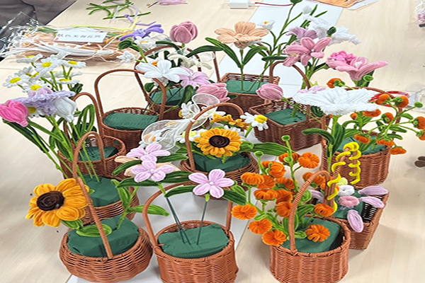 活动现场,学院精心布置了温馨的创作空间,准备了彩虹色系扭扭棒、花艺铁丝、装饰彩珠等专业手工材料。在志愿者的示范引导下,参与者们从基础技法学起,逐步掌握花瓣塑形、花枝缠绕、花束组合等编织技巧。同学们充分发挥创意,将普通的彩色金属丝幻化成玫瑰、牡丹、郁金香等花卉造型。