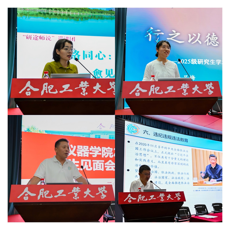见面会后,入学教育系列专题活动同步开展。院长夏豪杰介绍合肥市情、学院沿革、学科成果及就业前景,激发学生服务国家战略的热情;副院长邱龙臻结合案例强调实验室规范、安全防护与信息保密要求;党委副书记兼纪委书记刘萍通过违纪、学术不端等实例解读校纪校规,强化纪律与法治意识;研究生教学秘书高大军详解专业培养方案与毕业要求,指导科研规划。
