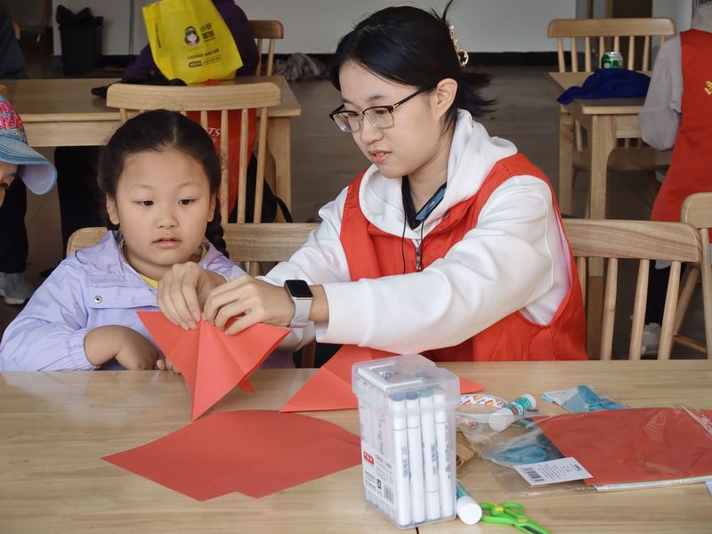 活动实施过程中,志愿者团队充分发挥专业引导作用,对彩纸裁剪、花瓣折叠、花枝缠绕等关键制作步骤进行规范示范,结合通俗化讲解拆解操作要点,助力参与者快速掌握制作技巧。在家长的悉心陪伴与志愿者的巡回指导下,孩子们主动参与、大胆创新,指尖翻飞间,将创意巧思融入每一片“花瓣”的折叠与粘贴,亲手打造出一束束独具个性的纸艺花束。互动过程中,志愿者耐心回应孩子们的疑问、及时纠正操作偏差,温馨和谐的互动氛围,让孩子们在实践中锤炼动手能力、培育创新思维,切实感受亲子陪伴与志愿关怀的双重暖意。