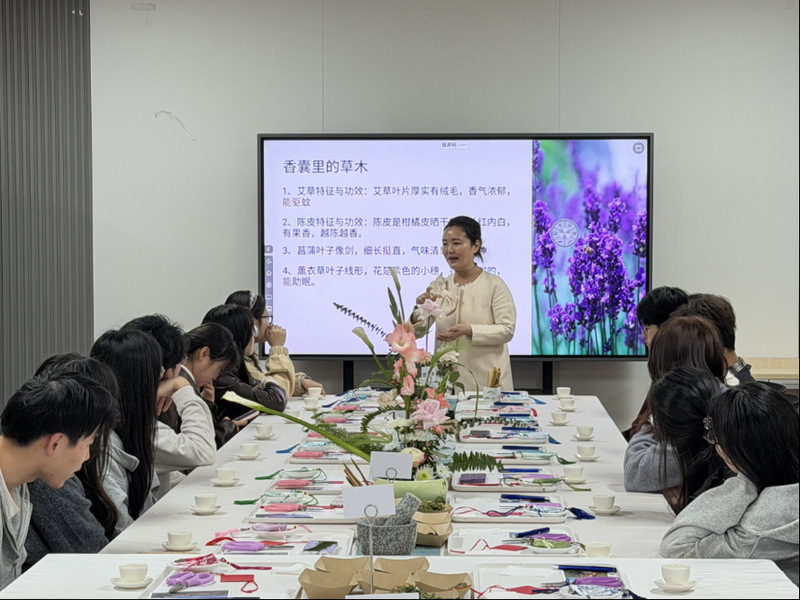 活动中,主讲老师围绕中华茶文化的历史渊源、品茗礼仪和养生内涵进行了讲解,并结合现场演示带领同学们识茶、闻香、品茶,在茶香氤氲中体会传统文化的雅致与宁静。随后,同学们在工作人员引导下领取材料包,了解香囊的文化寓意、制作方法和填充技巧,亲手完成香囊制作。活动现场气氛轻松融洽,同学们在交流互动中放松身心、增进了解,一个个造型精巧、香气清雅的香囊作品逐渐成形。